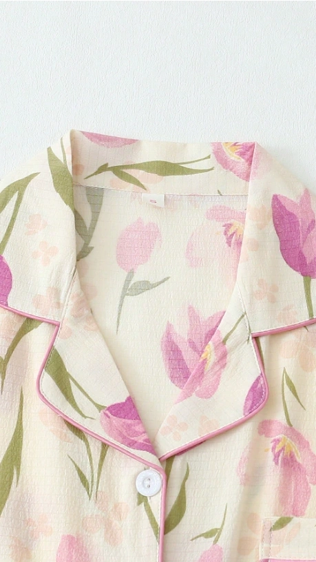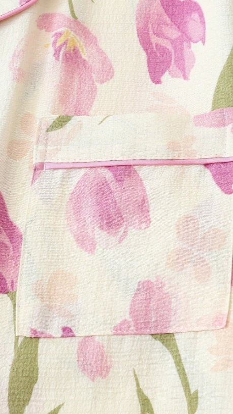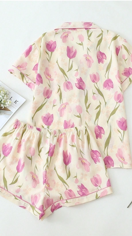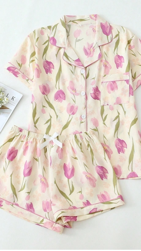 2pcs Women Tulip Floral Print V-Neck Button Short Sleeve Top