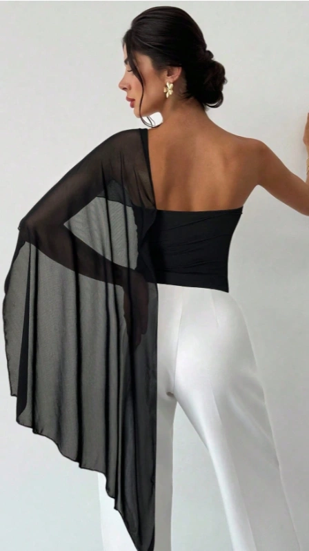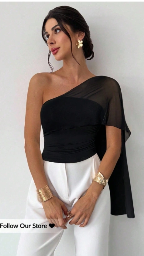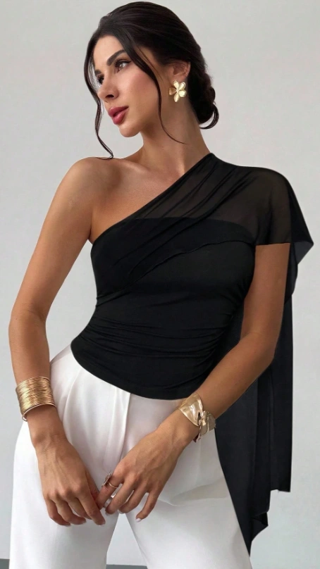Asymmetrical Shoulder Splice Mesh Knit Asymmetrical Ruffle Fitted Blouse