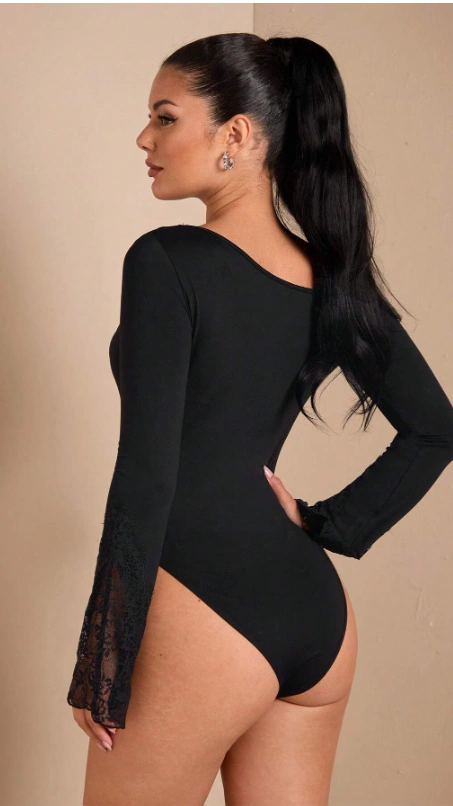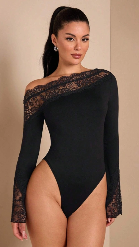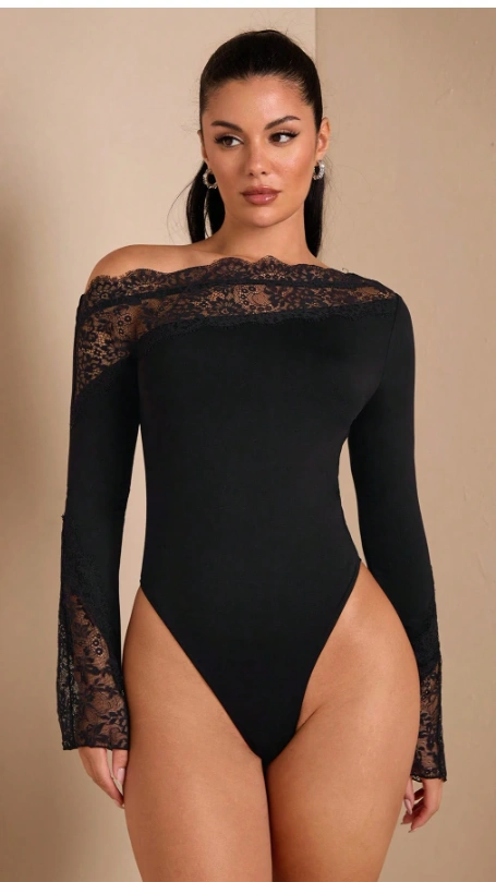 Elegant Asymmetric Lace Splice Off-Shoulder Long Flare Sleeve Bodysuit