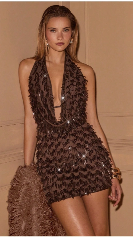 Brown Color Sequin Sexy V Neck Baxkless Halter Neck Mini Dress