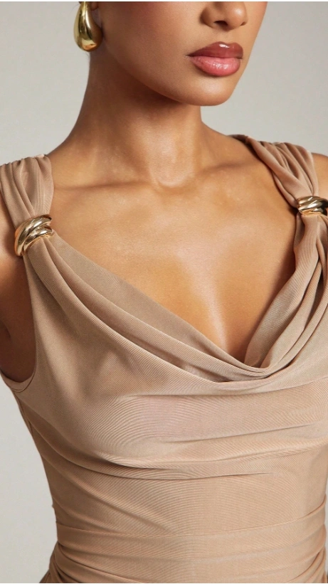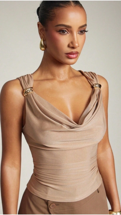 Casual Ruched Shoulder Gold Detail Cowl Neck Top
