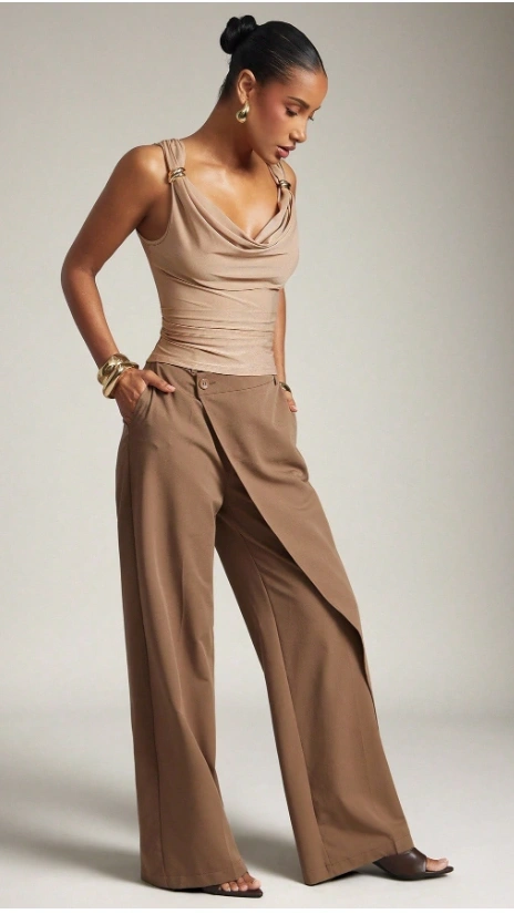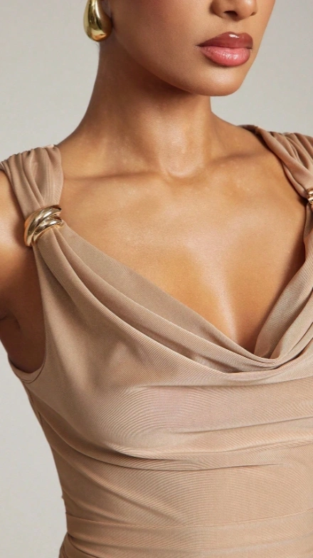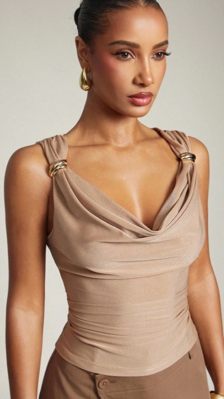 Casual Ruched Shoulder Gold Detail Cowl Neck Top