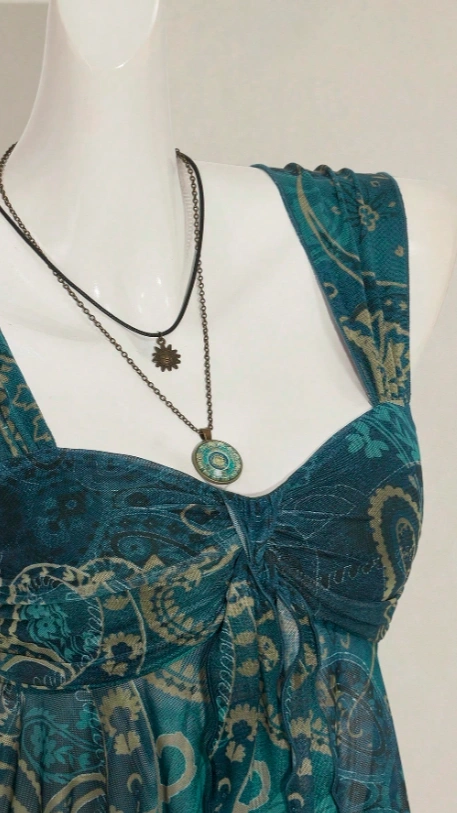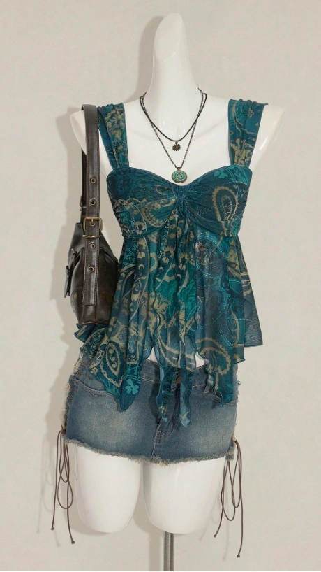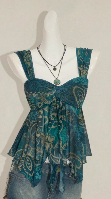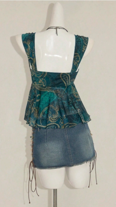 Chest Tie Pleated Slit Asymmetrical Hem Mesh See-Through Top