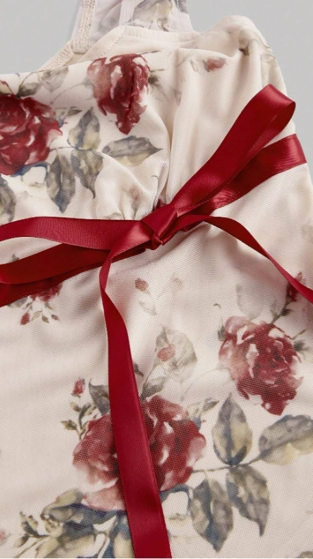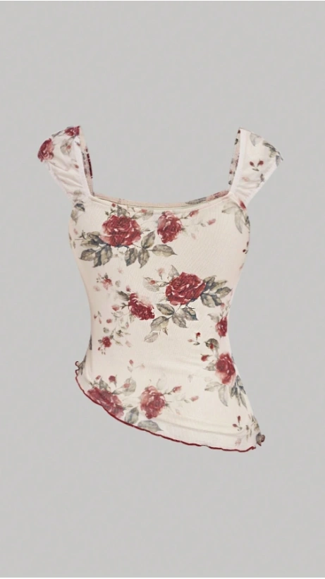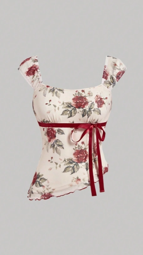 Elegant Ribbon Decorated Asymmetrical Hem Flower Print Tank Top