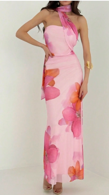 Floral Mesh Ribbon Tube Top Long Dress