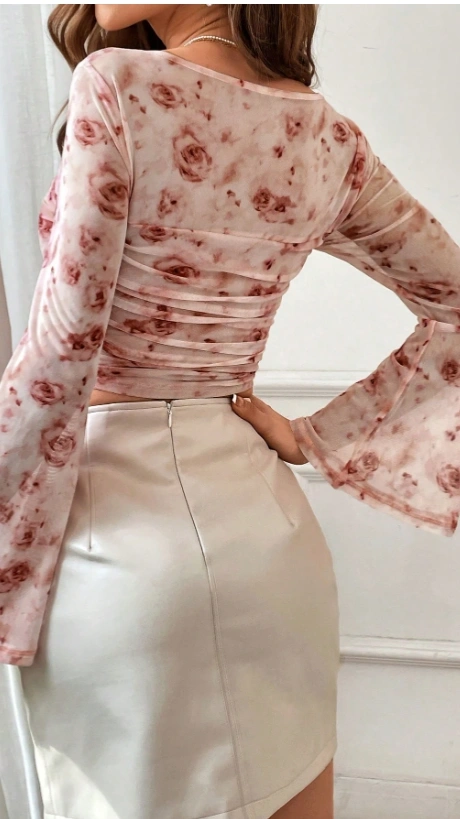 Floral Print Square Neck Ruffle Handkerchief Hem T-Shirt