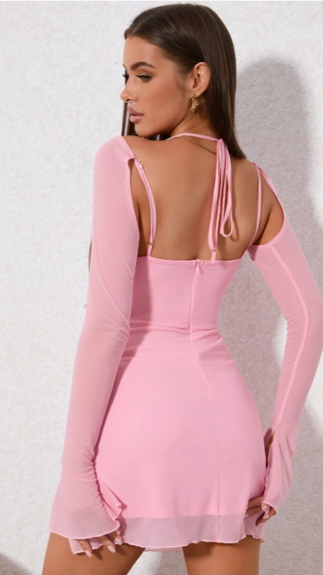 Flounce Sleeve Ruched Side Split Hem Mesh Dress