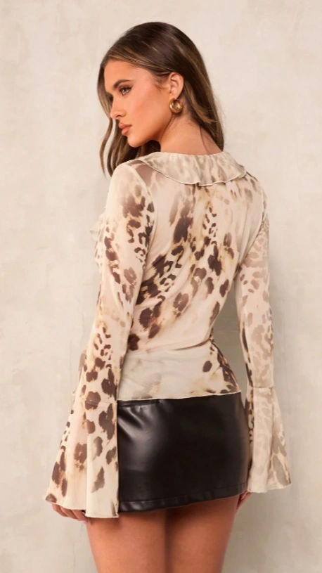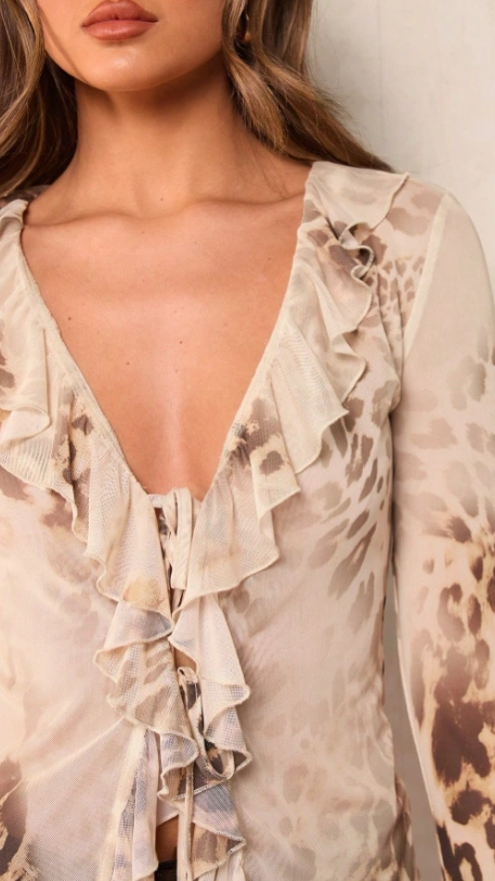 Front Tie Long Sleeve Printed Casual Blouse