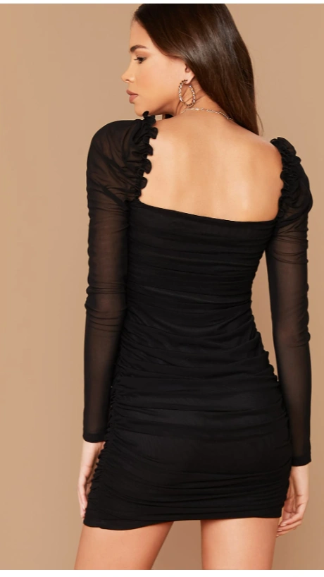 Gigot Sleeve Ruched Mesh Overlay Short Dress