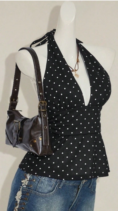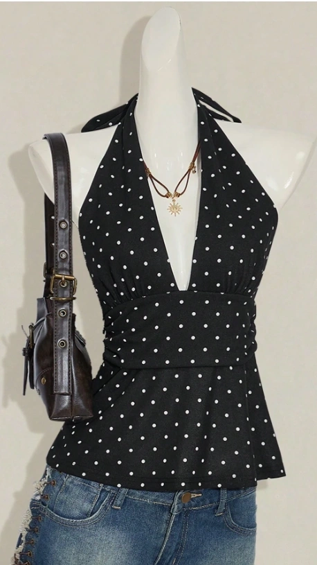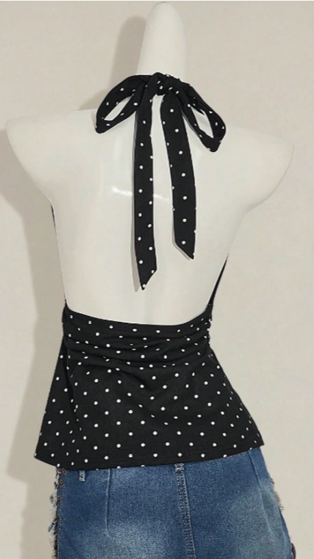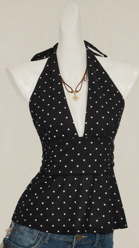 Halter Deep V-Neck Polka Dot Top Wrap Back Top