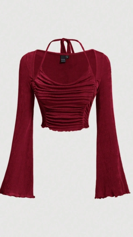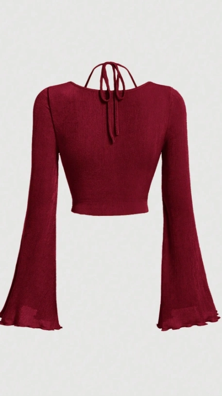 Lettuce Trim Tie Backless Bell Sleeves Red Crop Tee