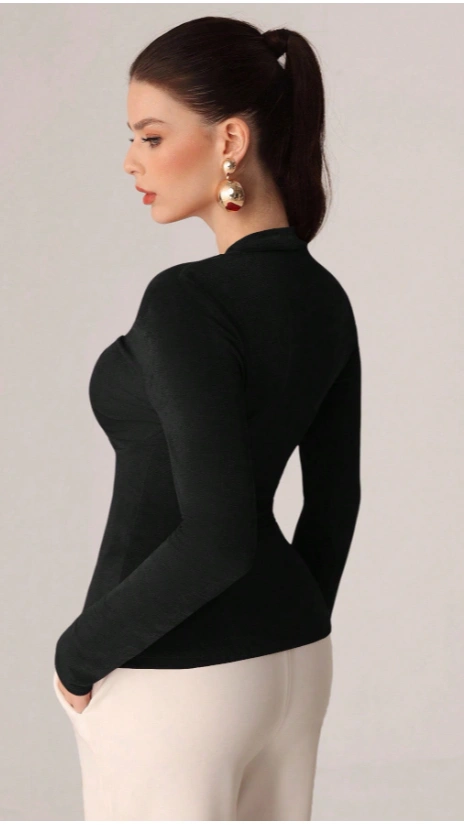 Metal Buckle V-Neck Pleated Long Sleeve Elegant Fitted T-Shirt