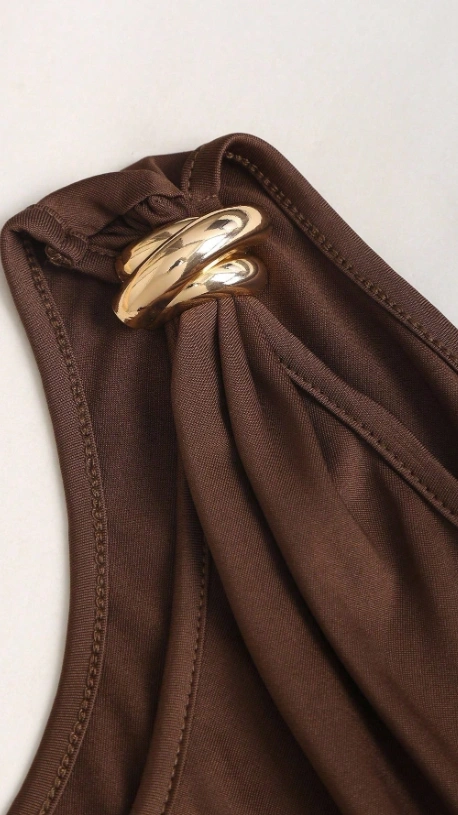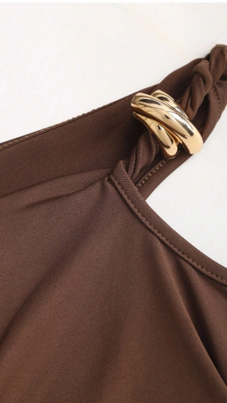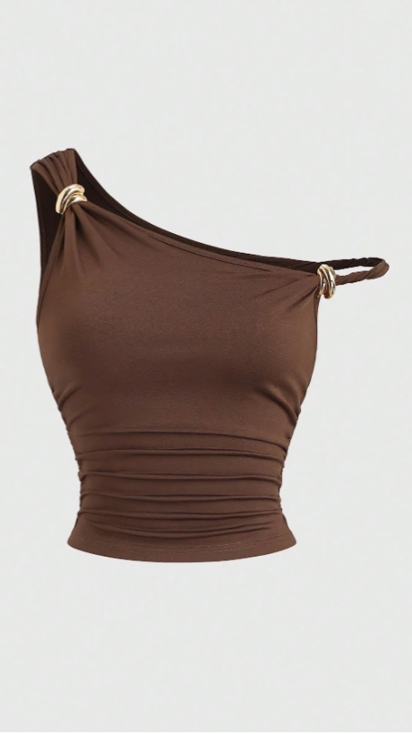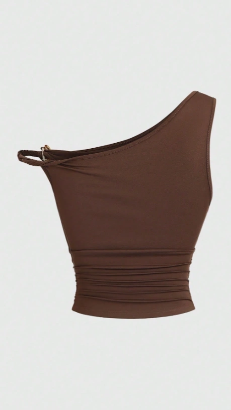 Metal Decor Asymmetric Neckline Twist Ruched Slim Top