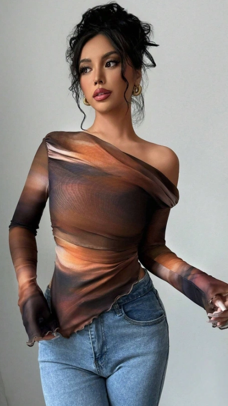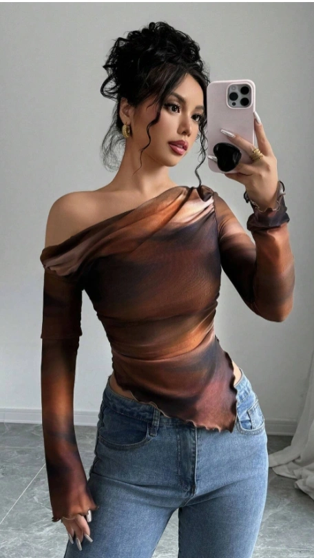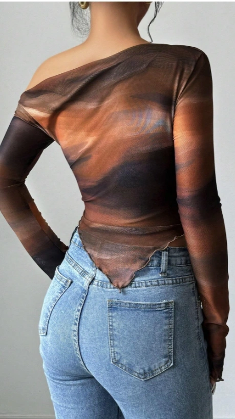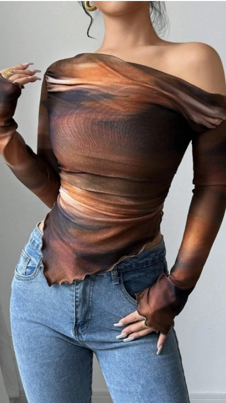 Neck Tie Dye Print Long Sleeve Fitted Fashion T-Shirt