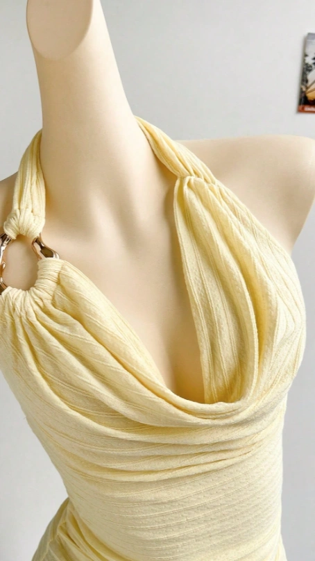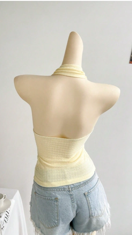 Pale Yellow Textured Knit Shoulder Strap Top