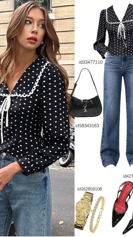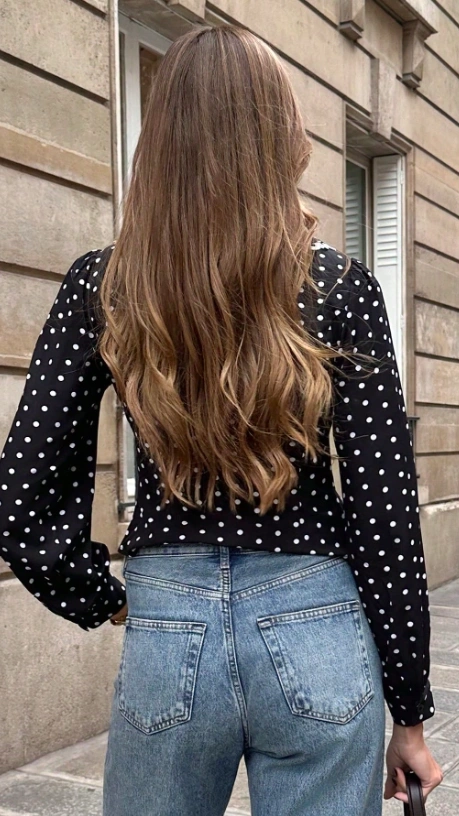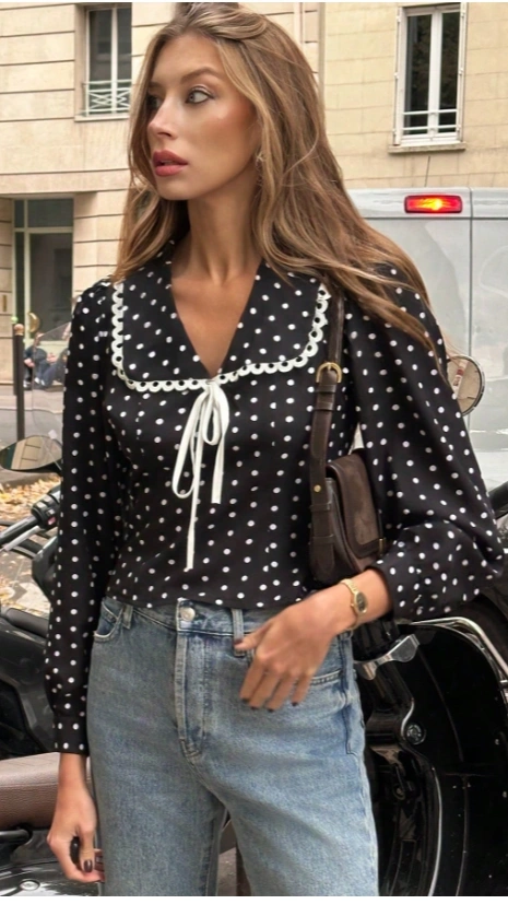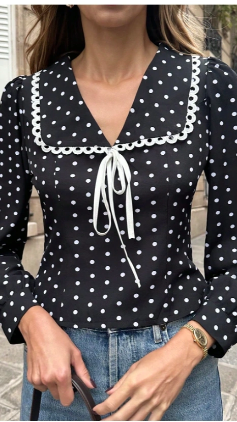Polka Dot Casual French Style Short Black Blouse