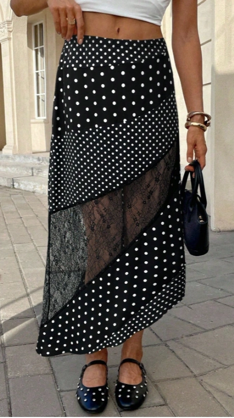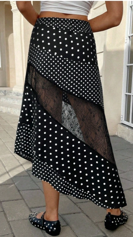 Polka Dot Print Contrast Lace Skirt