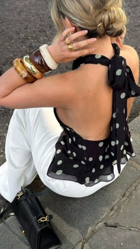 Polka Dot Print Open Back With Self-Tie Top