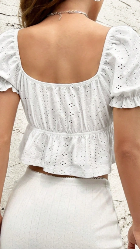 Puff Sleeve Knot Front Peplum Crop White Tee Top