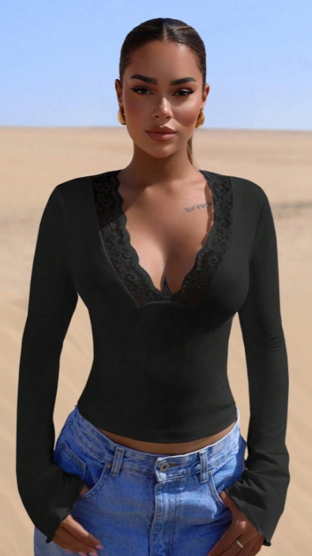 Slim Fit V-Neck Lace Splicing Solid Color Long Sleeve Casual Top