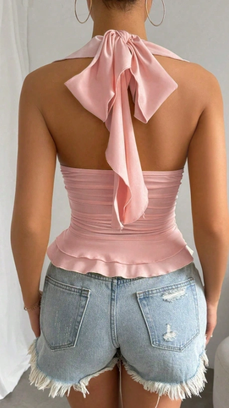 Solid Color Ruffle Trim Pleated Sexy Fashion Halter Neck Camisole Top