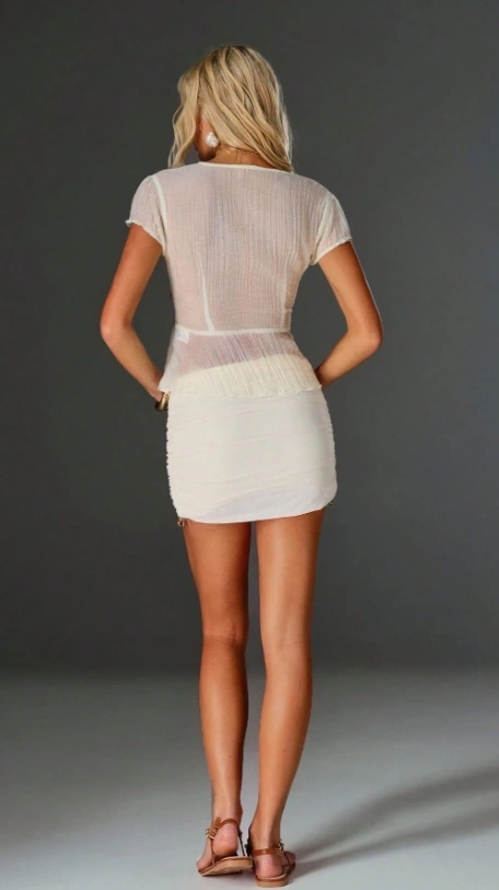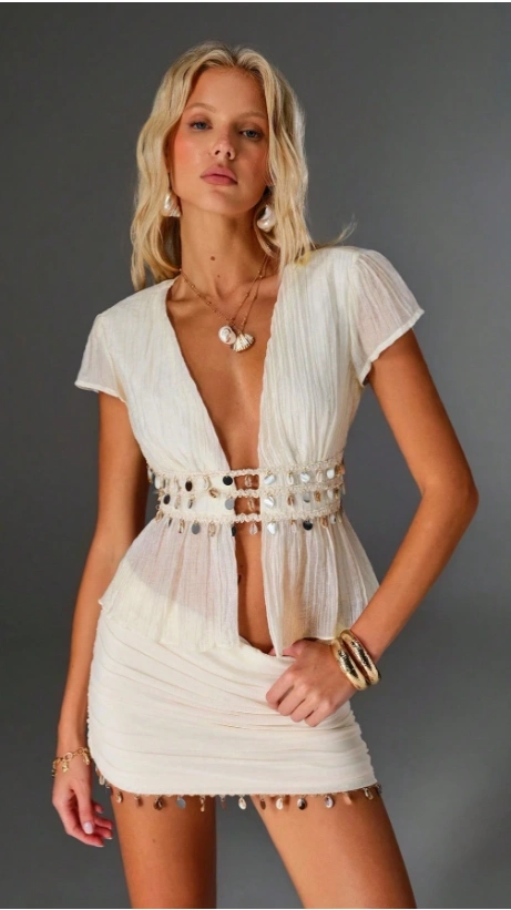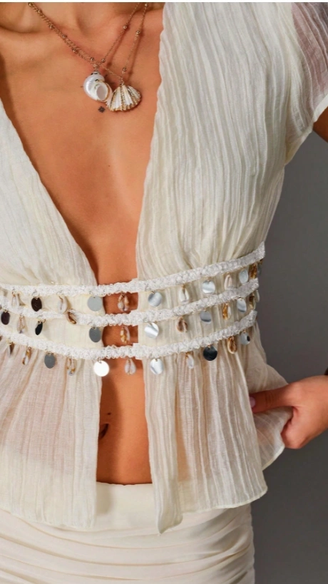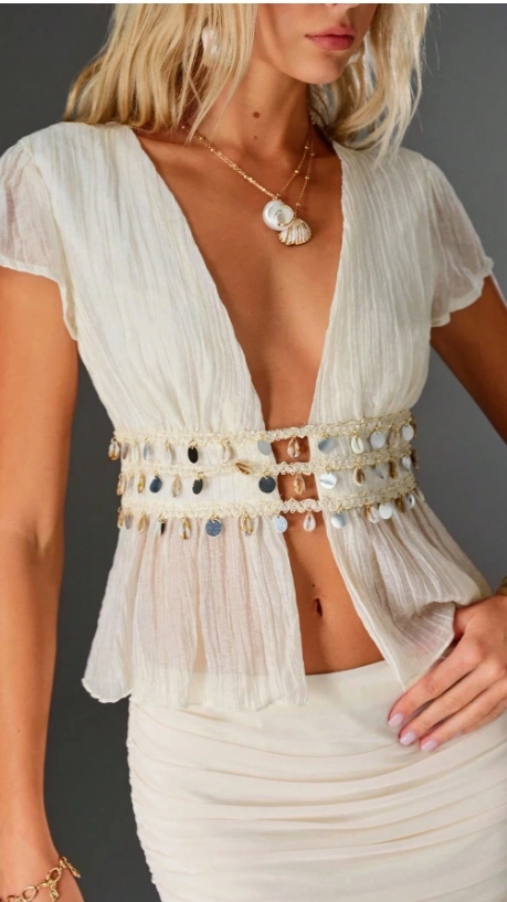 Textured Shell Decor Deep V Neck Slim Fit Beach Ruffle Top