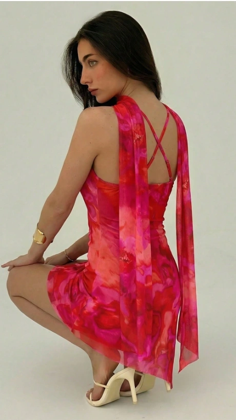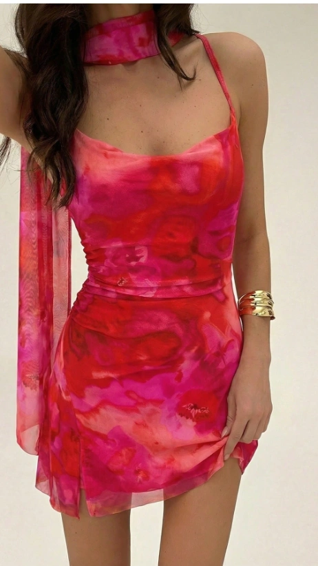 Tie Neck Bodycon High Slit Asymmetrical Hem Tie Dye Floral Mini Dress