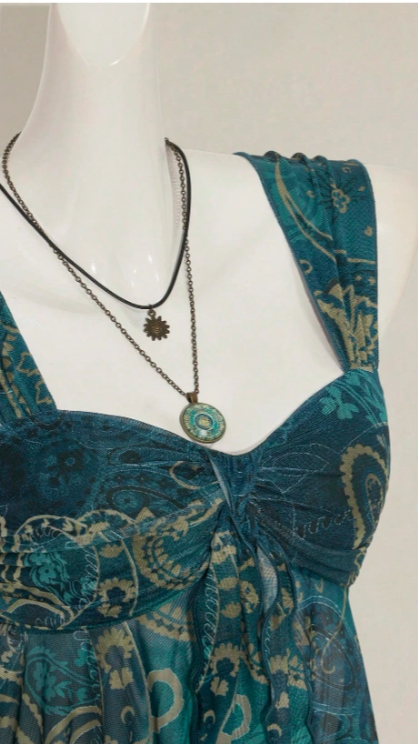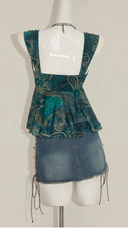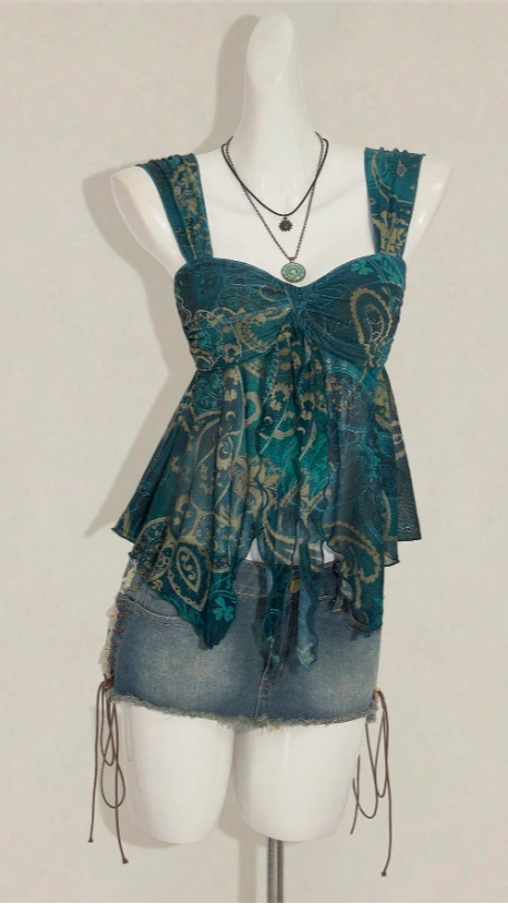 Tie Pleated Slit Asymmetrical Hem Mesh See-Through Top
