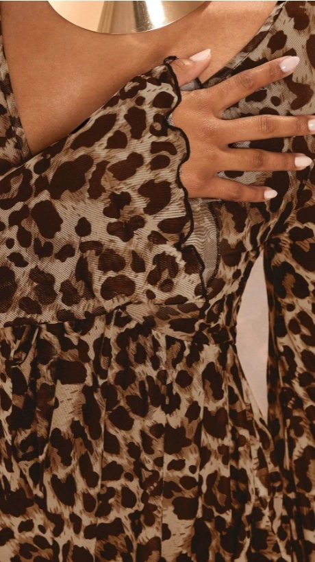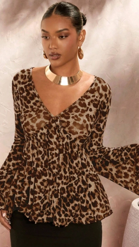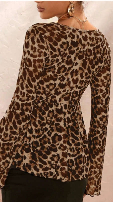 V-Neck Flare Sleeve Leopard Print Knitted Mesh Vacation Top