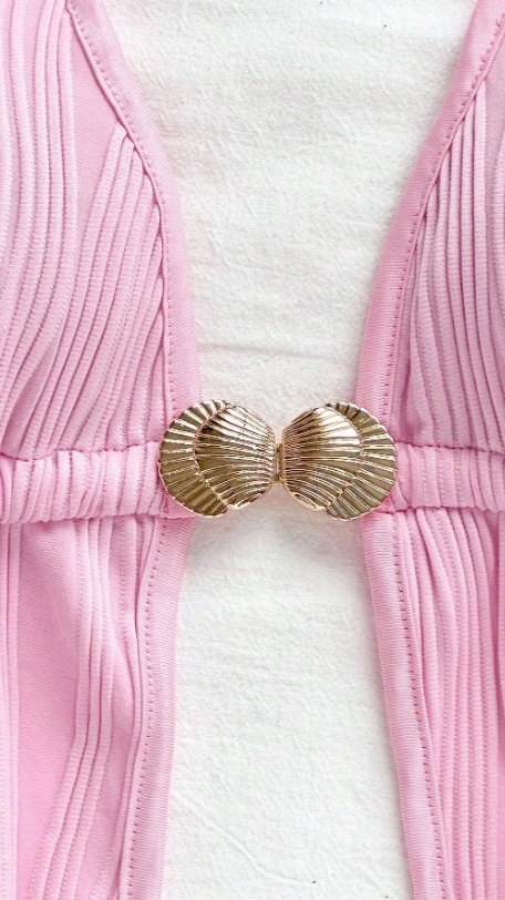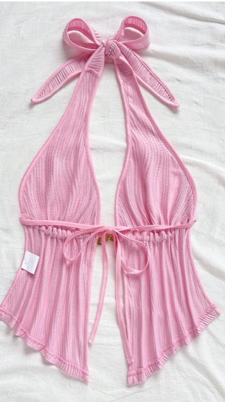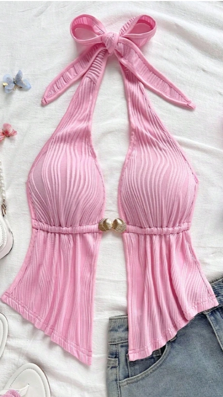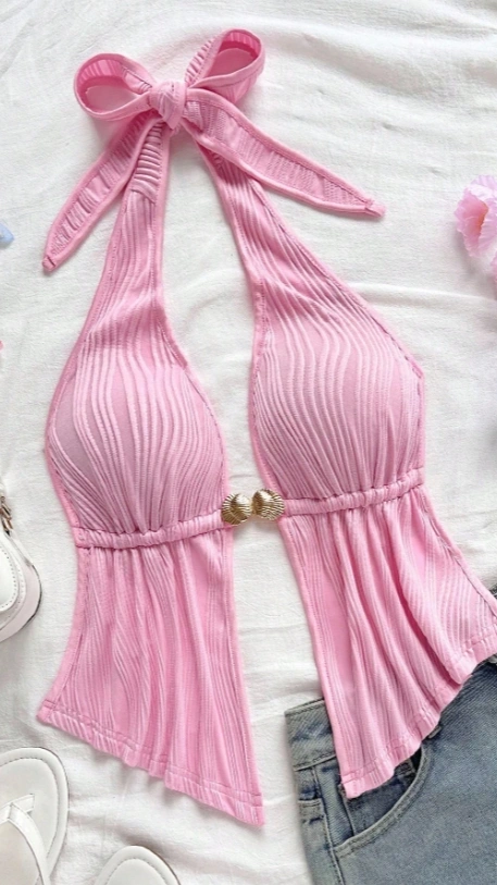 V-Neck Metal Decor Halter Ruffled Open Back Textured Fabric Women Cami Top