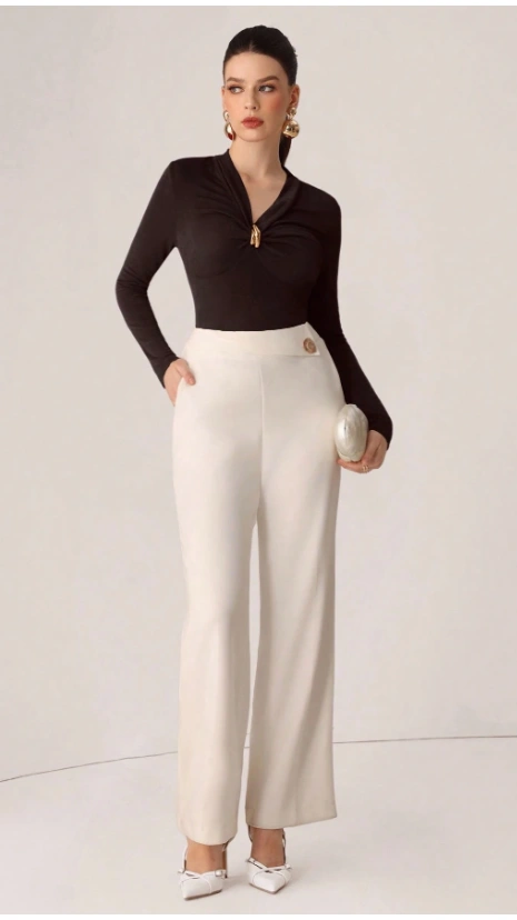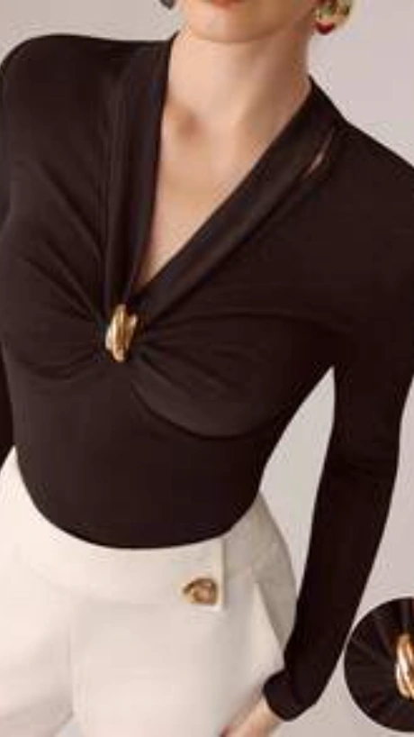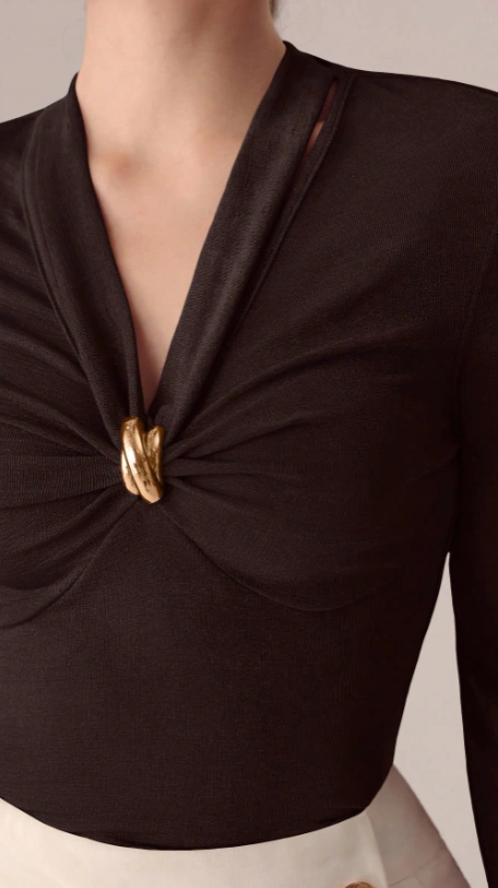 V-Neck Pleated Long Sleeve Elegant Fitted T-Shirt
