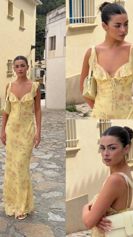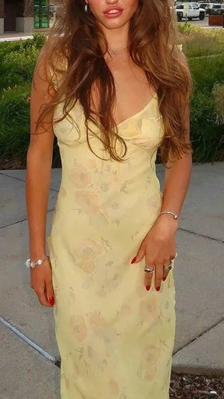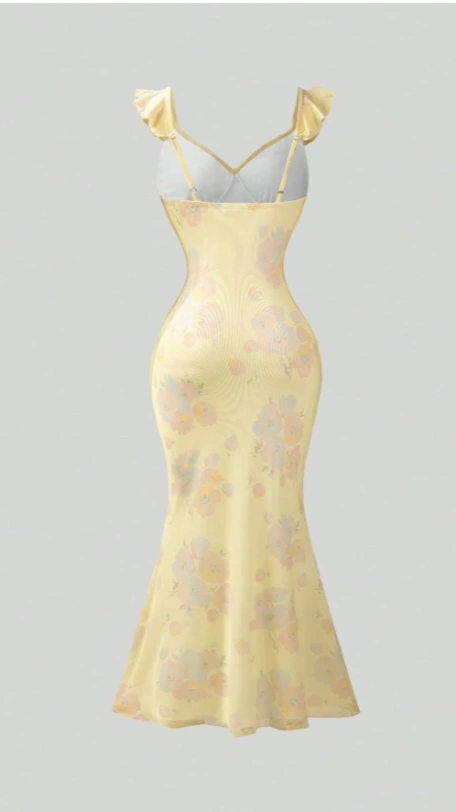 Y2K Floral Print V-Neck Mesh Ruffle Trim Wide Strap Fitted Mermaid Dress